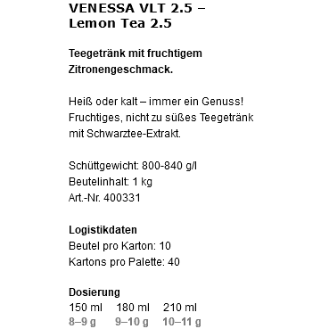 Der Venessa VLT 2,5 Lemon Tea wurde speziell für den Einsatz in Vending-Automaten konzipiert und überzeugt neben seinem exquisiten Geschmack durch alle wichtigen Qualitätseigenschaften für Instant-Getränke.